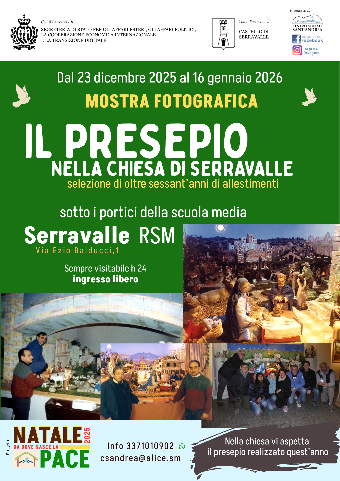A grande richiesta è stata riallestita la MOSTRA FOTOGRAFICA dedicata ai presepi realizzati da oltre settant’anni IL PRESEPIO NELLA CHIESA DI SERRAVALLE e sarà visitabile (h24) a Serravalle, presso i portici della Scuola Media, ingresso libero. Un modo tutto speciale per augurare un Natale di Pace a tutti da parte del Centro Sociale S. Andrea.