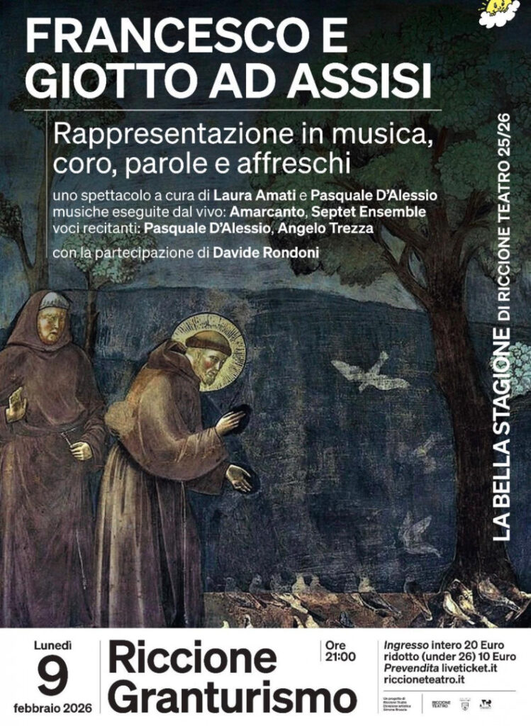 Nell’anno in cui si celebra l’ottavo centenario della morte di Francesco d’Assisi, va in scena un dialogo profondo tra la voce poetica del santo, la forza degli affreschi di Giotto e una tessitura musicale che attraversa epoche e linguaggi diversi. A fare da guida visiva allo spettacolo è lo splendido ciclo pittorico della Basilica superiore di Assisi, e in particolare sei affreschi che raffigurano gli episodi più emblematici della vita di Francesco. L’immagine dipinta e la parola si uniscono, in un viaggio simbolico e sensoriale condotto dal poeta, scrittore e saggista Davide Rondoni, presidente del Comitato nazionale per i festeggiamenti dell’ottavo centenario. Insieme a due voci recitanti Rondoni fa rivivere la forza del messaggio di Francesco, universale e contemporaneo, mentre l’Ensemble Amarcanto accompagnato da un quartetto d’archi propone un programma musicale che va dalla purezza della musica antica alla potenza evocativa della tradizione popolare, fino al canto d’autore contemporaneo.