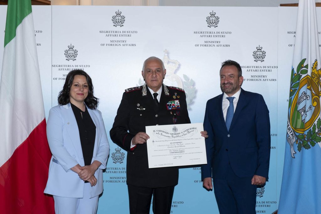 A coronamento dell’incontro, sempre in mattinata, il Segretario di Stato Beccari ha inoltre conferito al Generale Teo Luzi l’Onorificenza del grado di Cavaliere Grand’Ufficiale dell’Ordine Equestre di Sant’Agata.