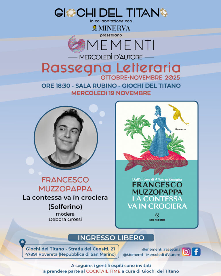 La rassegna letteraria Mementi – Mercoledì d’Autore, ormai punto di riferimento del panorama culturale autunnale, si prepara ad accogliere uno degli scrittori più apprezzati della narrativa contemporanea italiana: Francesco Muzzopappa. L’incontro è in programma mercoledì 19 novembre alle 18:30 nella suggestiva Sala Rubino di Giochi del Titano, in Strada dei Censiti 21 a Rovereta, nella Repubblica di San Marino.