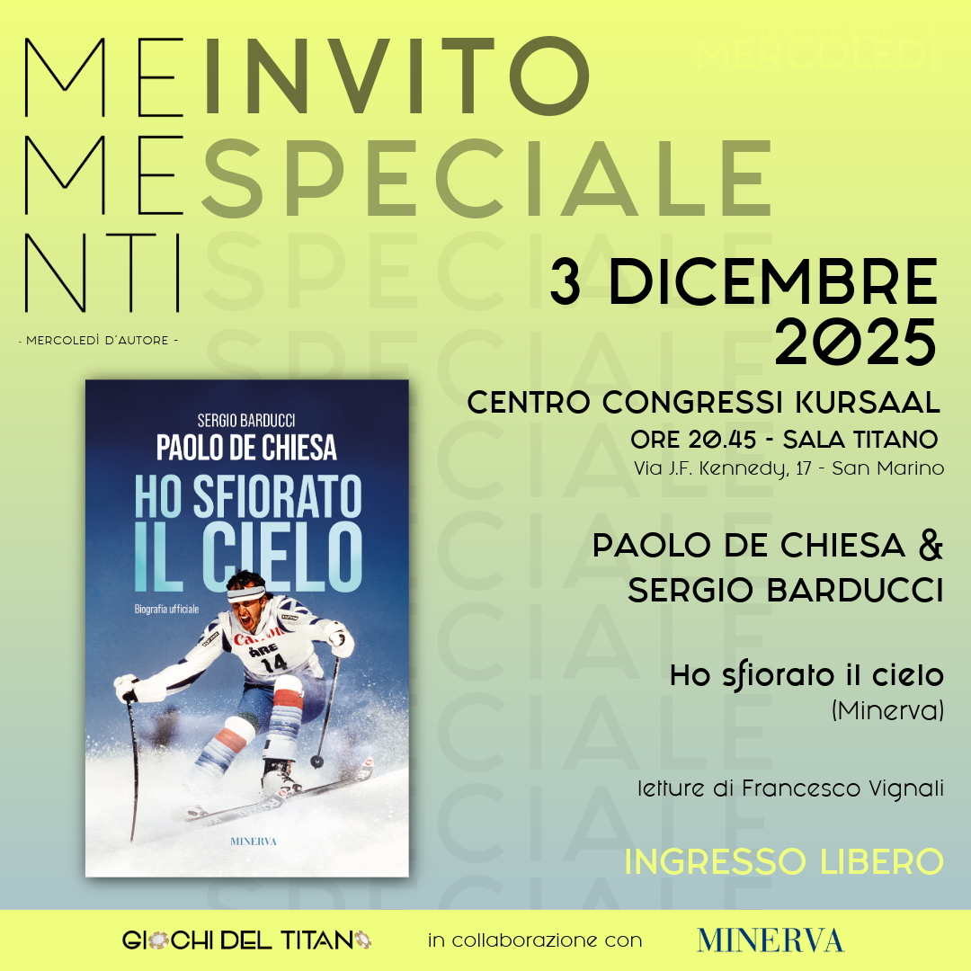 Sarà una serata dedicata al racconto sportivo e alla memoria quella in programma il 3 dicembre 2025 al Centro Congressi Kursaal, dove Paolo De Chiesa e Sergio Barducci presenteranno il volume Ho sfiorato il cielo, pubblicato da Minerva. L’appuntamento, previsto alle ore 20.45 nella Sala Titano, rientra nel ciclo “Mementi – Mercoledì d’Autore” promosso da Giochi del Titano in collaborazione con la casa editrice.