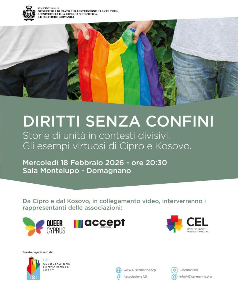 San Marino. Associazione 121, invito all’evento: “Diritti senza confini, storie di unità in contesti divisivi. Gli esempi virtuosi di Cipro e Kosovo”