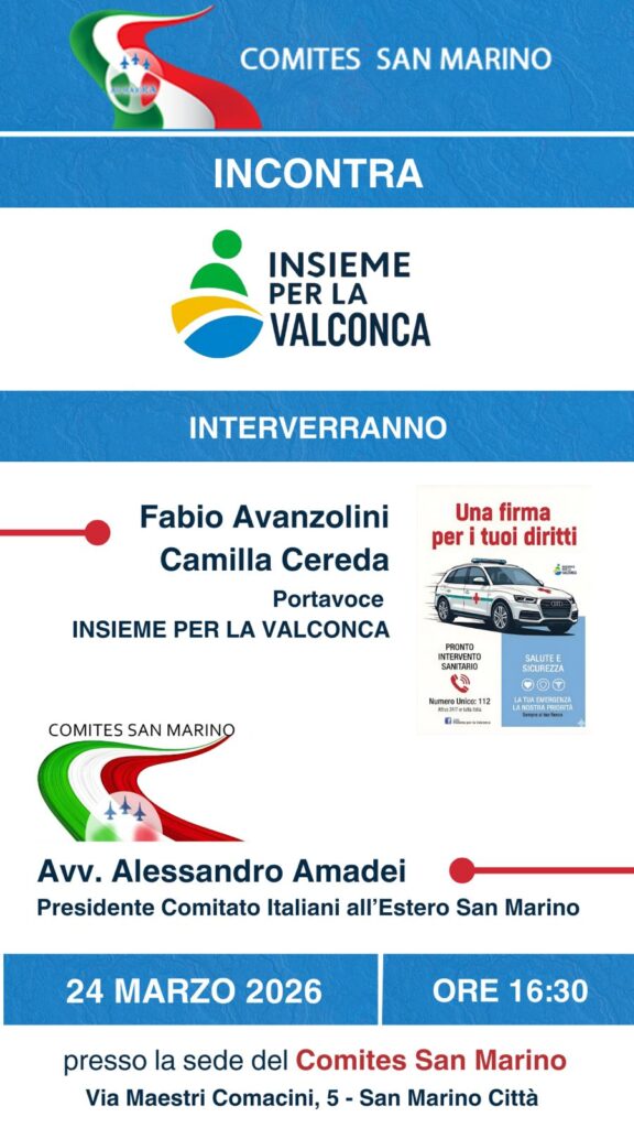 Il gruppo Insieme per la Valconca martedì prossimo sarà ospite del Comites San Marino il prossimo 24 marzo alle ore 16:30. Al centro del confronto la sanità in Valconca, un tema che riguarda ovviamente tutti i residenti nei Comuni limitrofi a San Marino, dove, oltre ai tanti lavoratori che ogni giorno varcano il confine tra i due Stati, anche moltissimi italiani residenti in Repubblica hanno origini, familiari e affetti. Nello specifico, Insieme Per la Valconca esporrà la propria preoccupazione per la soppressione dell’automedica, che secondo i promotori dell’associazione, ha ridotto drasticamente la possibilità di sopravvivenza dei pazienti più critici della zona sud della provincia di Rimini, in quanto la sola ambulanza con infermiere ed autista soccorritore può prestare un’assistenza parziale non potendo gestire in modo adeguato il paziente. Il paziente, secondo Insieme per la Valconca, dovrà attendere più di 17 minuti l’arrivo dell’automedica e per questo, da tempo, l’associazione richiede il ripristino del servizio.