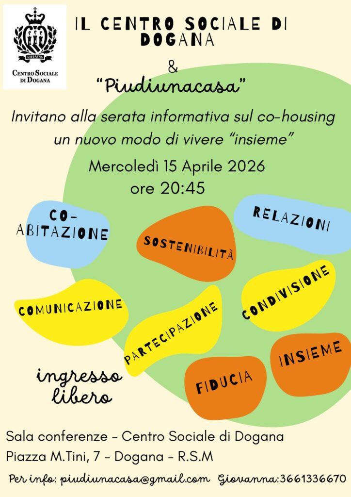 Una serata pubblica e gratuita promossa da “Piudiunacasa” e dal Centro Sociale di Dogana e dedicata al “Cohousing”, si terrà presso il Centro Sociale di Dogana mercoledì 15 aprile alle ore 20,45. Da diversi anni ormai si sente parlare di Cohousing e questa serata è quindi un’ interessante occasione per conoscere meglio questa realtà.