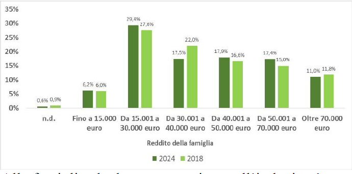 Una parte degli acquisti viene effettuata con modalità on line, in particolare le spese relative alle vacanze (948 euro) e all’abbigliamento (449 euro), oltre che una voce generica indicante beni e servizi pari a 1.423 euro. Il reddito medio annuo familiare nel 2024 è pari a 42.995 euro (+2,8% rispetto al 2018) e la fascia più numerosa è quella compresa tra 15.001 euro e 30.000 euro, in aumento rispetto alla precedente rilevazione. Alle famiglie che hanno partecipato all’indagine è stata chiesto un giudizio sulla propria situazione economica rispetto all’anno precedente: il 55,4% l’ha giudicata invariata, il 21,7% lievemente peggiorata e il 10,1% molto peggiorata. Solo il 10% e il 2,8% l’ha definita rispettivamente migliorata e molto migliorata. La maggior parte delle famiglie dichiara di essere proprietaria dell’abitazione di residenza (72,6%), mentre solo il 18,8% la occupa con un contratto di locazione e il 5,4% risiede nella propria abitazione a titolo gratuito. Il 62,3% delle famiglie ha la piena proprietà dell’abitazione di residenza e il 29% sta pagando un mutuo.