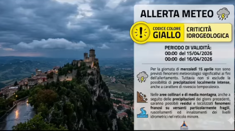 Periodo di validità dalle ore 00:00 del 15/04/2026 alle ore 00:00 del 16/04/2026. Per la giornata di mercoledì 15 aprile non sono previsti fenomeni meteorologici significativi ai fini dell’allertamento. Tuttavia non si esclude la possibilità di precipitazioni localmente intense, anche a carattere di rovescio temporalesco. Nelle aree collinari e di media montagna, anche a seguito delle precipitazioni dei giorni precedenti, saranno possibili residui e localizzati fenomeni franosi su versanti particolarmente fragili, ruscellamenti ed innalzamenti dei livelli idrometrici nel reticolo minore.