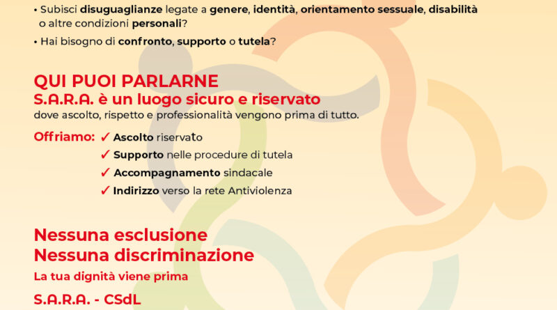 Read MoreS.A.R.A. è il nuovo servizio offerto dalla CSdL: Spazio d’Ascolto Riservato e Accogliente, per offrire supporto e tutela alle persone che sui