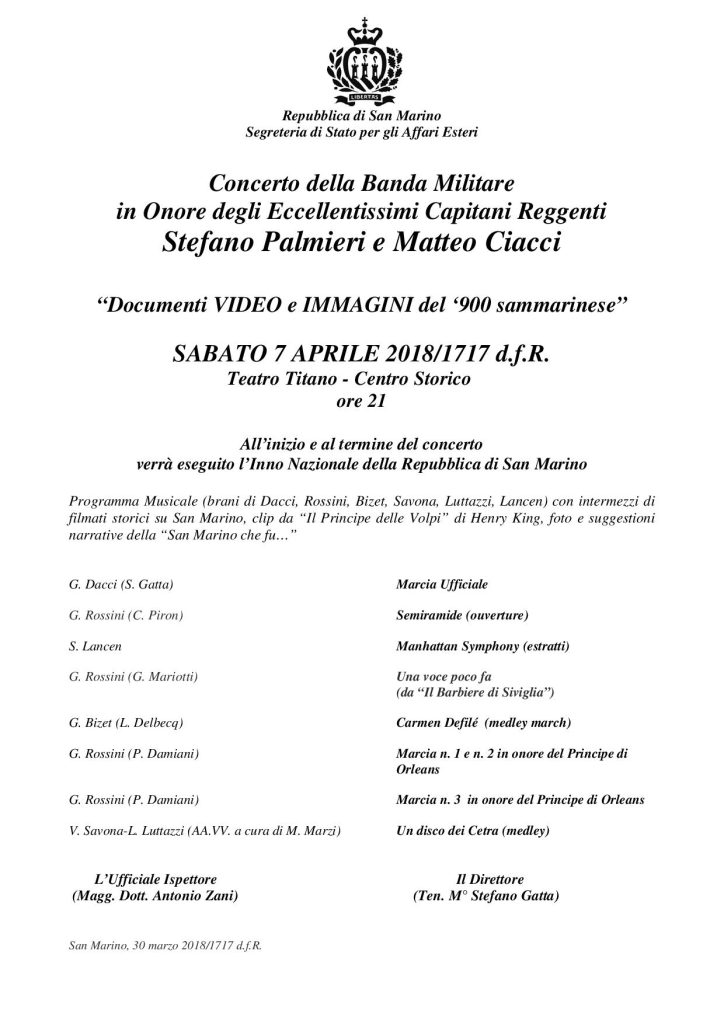 Il programma prevede una formula innovativa e coinvolgente: il concerto sarà intercalato dalla riproduzione di immagini e video relativi a scene di vita sammarinesi nel XX secolo, tratti da celebri film e da cinegiornali dell’Istituto Luce. Le musiche dal vivo, eseguite dalla Banda Militare, accompagneranno le proiezioni con l’ausilio di suggestioni narrative. Il Concerto porterà in scena la storia di San Marino, intrecciata con la storia del mondo e con i drammatici eventi che hanno caratterizzato il ‘900, le guerre e il ruolo di San Marino come esempio di neutralità e solidarietà. Allo stesso tempo San Marino viene raccontata in quanto luogo magico e senza tempo, ideale per set cinematografici di colossal come “Il principe delle volpi” di Henry King, con interpreti del calibro di Tyrone Power e Orson Welles. Il montaggio delle immagini è a cura dei tecnici Massimo Grossi e Ruggero (Roger) Toccaceli; i testi sono invece curati da Stefano Gatta e Alessandro Cecchini. La Banda Militare suonerà musiche di Dacci, Rossini, Bizet, Lancen, Savona e Luttazzi sotto la direzione del Ten Maestro Stefano Gatta. La cittadinanza è caldamente invitata a partecipare.