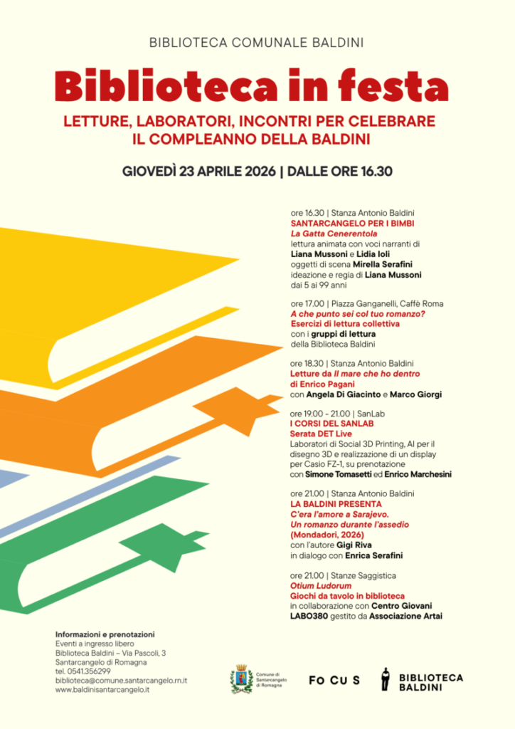 Giovedì 23 aprile la Biblioteca Baldini festeggia i dodici anni nella nuova sede con un pomeriggio e una serata di letture, laboratori e incontri.