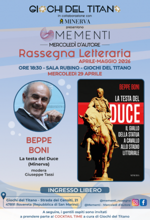 Mercoledì 29 aprile alle 18.30, alla Sala Rubino di Giochi del Titano a Rovereta, appuntamento con la rassegna letteraria Mementi – Mercoledì d’autore. Ospite della serata sarà il giornalista e scrittore Beppe Boni, che presenterà il libro La testa del Duce (Minerva), un’indagine sul mistero della statua a cavallo allo Stadio Littoriale. A moderare l’incontro Giuseppe Tassi. Ingresso libero, con cocktail finale offerto agli ospiti.