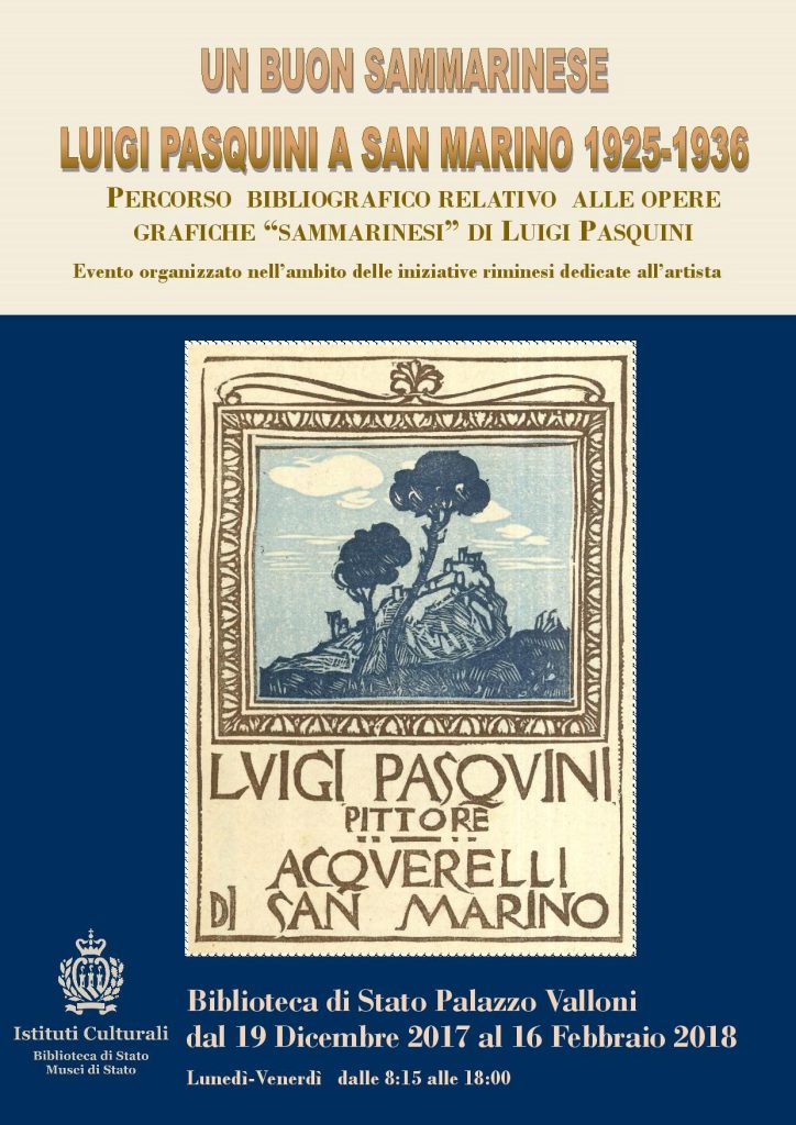 San Marino. Il percorso bibliografico relativo alle opere grafiche di Luigi Pasquini, realizzato dagli istituti Culturali. Biblioteca e Museo di Stato, allestito a Palazzo Valloni da 19 Dicembre 2017 al 16 Febbraio 2018, si inserisce in una serie di eventi legati alla figura dell’artista riminese.