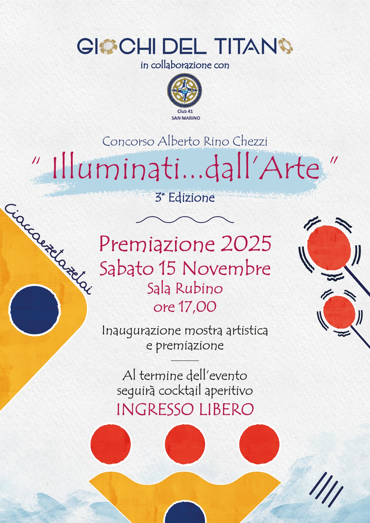 La terza edizione del concorso artistico “Illuminati… dall’Arte”, promosso dai Giochi del Titano in collaborazione con il Club 41 San Marino, si prepara a vivere il suo momento più atteso. La cerimonia di premiazione si terrà sabato 15 novembre 2025, alle ore 17.00, nella suggestiva cornice della Sala Rubino.