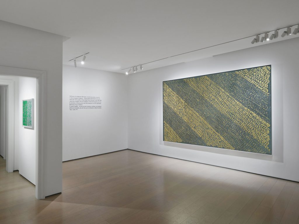L’artista sceglie ora per la prima volta di ricorrere a questi pigmenti per spostare con decisione la sua pittura verso una nuova dimensione di luminosità, che coinvolge lo spazio oltre i confini della tela, in un dialogo che, negli stessi anni, la porta a concepire le prime radicali sperimentazioni ambientali con il sicofoil.