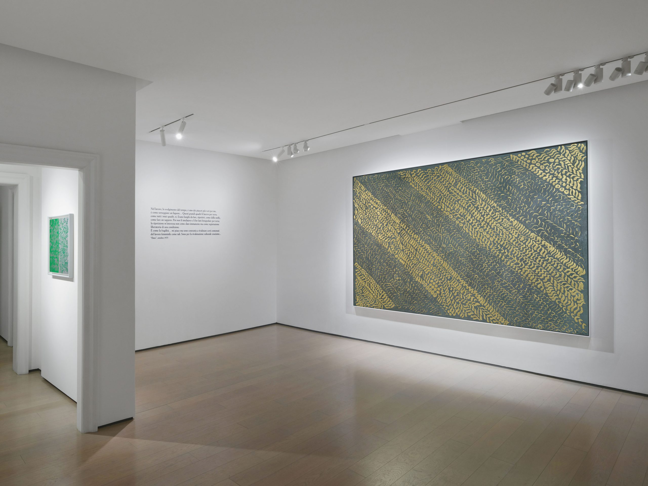 L’esposizione attualmente in corso, è dedicata a una selezione di opere di Carla Accardi eseguite tra il 1964 e il 1965. I dipinti, riuniti per la prima volta a documentare un nucleo ben definito, sono caratterizzati dall’uso di pigmenti oro e argento, una scelta con cui l’artista declina in termini del tutto inediti una personale riflessione sul rapporto fra segno, luce e spazio pittorico.