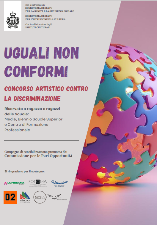La Commissione per le Pari Opportunità (CPO) comunica che lunedì 16 marzo 2026 alle ore 18:00, presso la “Sala Montelupo” di Domagnano, si terrà la premiazione del Concorso Artistico “Uguali non conformi!”, rivolto agli studenti e alle studentesse del biennio delle Scuole Superiori, delle classi terze delle Scuole Medie e del Centro di Formazione Professionale.