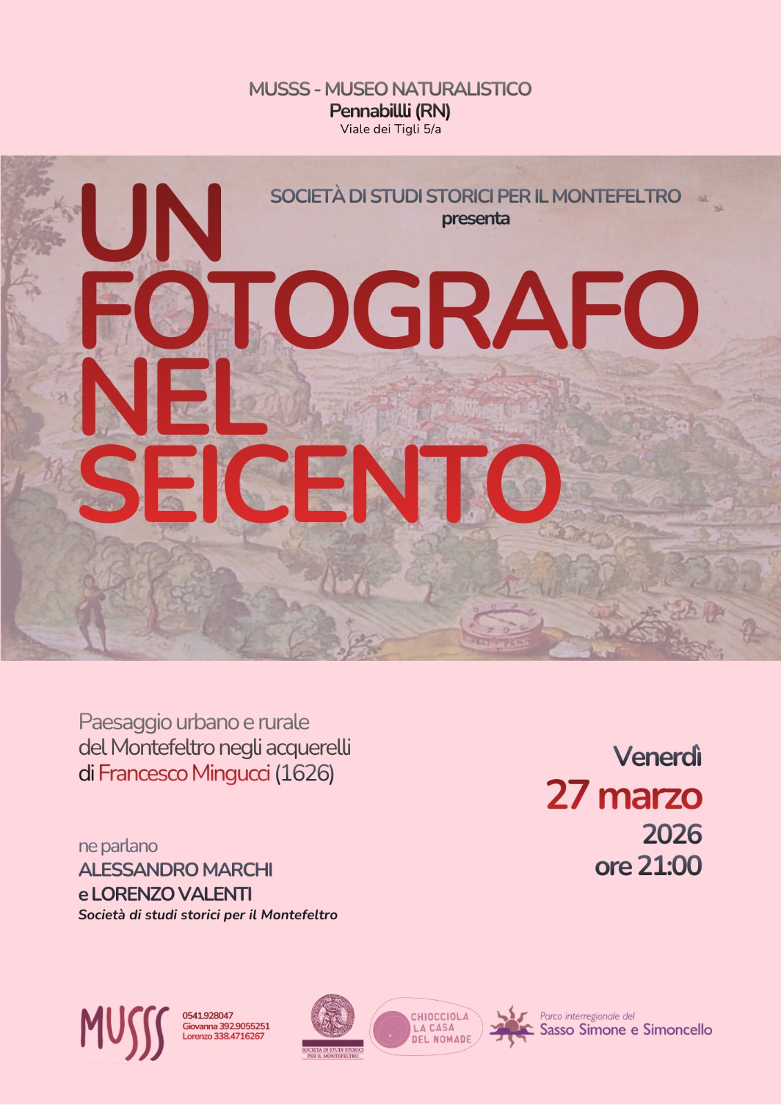 La Società di studi storici per il Montefeltro organizza per il 27 marzo a Pennabilli, un viaggio affascinante alla scoperta del paesaggio urbano e rurale del Montefeltro attraverso gli occhi (e i pennelli) di Francesco Mingucci. Ne parleranno Lorenzo Valenti e Alessandro Marchi.