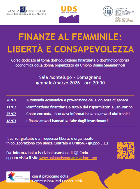 La Commissione per le Pari Opportunità della Repubblica di San Marino esprime il proprio patrocinio e sostegno al corso “Finanze al Femminile: Libertà e Consapevolezza”, un’iniziativa dedicata all’educazione finanziaria e alla promozione dell’indipendenza economica delle donne, organizzata dall’Unione Donne Sammarinesi in collaborazione con la Banca Centrale della Repubblica di San Marino e l’Università degli Studi della Repubblica di San Marino.