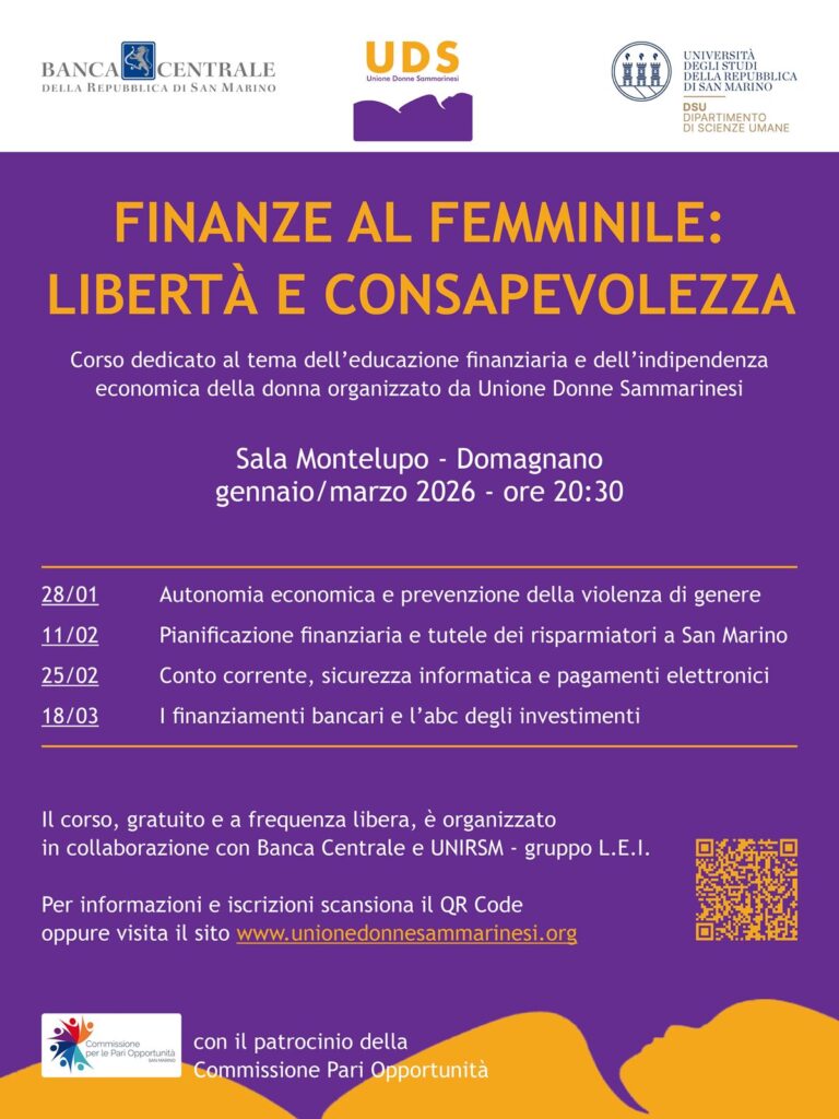 Mercoledì 11 febbraio, a partire dalle ore 20.30, presso la Sala Montelupo a Domagnano si terrà il secondo incontro del corso “Finanze al Femminile: Libertà e Consapevolezza”, promosso da Unione Donne Sammarinesi, con il patrocinio della Commissione Pari Opportunità e in stretta collaborazione con il Gruppo LEI dell’Università di San Marino e con Banca Centrale.
