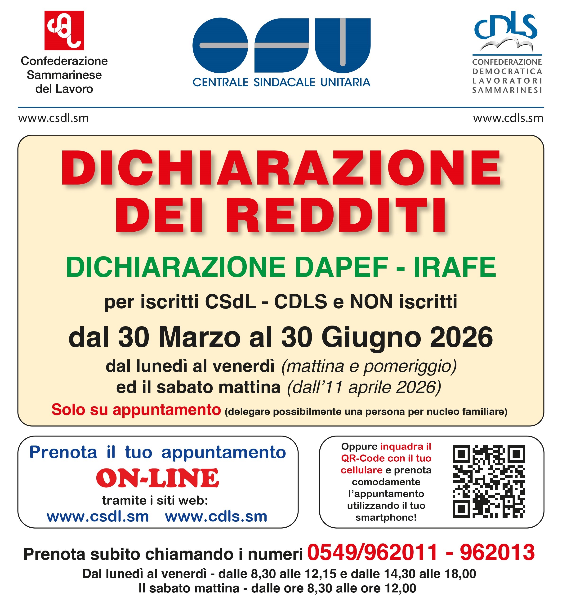 Si può fissare l’appuntamento utilizzando il comodo sistema di Prenotazione On-Line raggiungibile all’indirizzo https://csuservizi.prenotime.it,oppure tramite il link o il Qr code presente nei siti web della CSdL – www.csdl.sm e della CDLS – www.cdls.sm. Nei prossimi giorni sarà recapitato in tutte le abitazioni del territorio sammarinese un volantino informativo che promuove il servizio dichiarazioni della CSU, contenente tutte le informazioni utili per gli utenti.