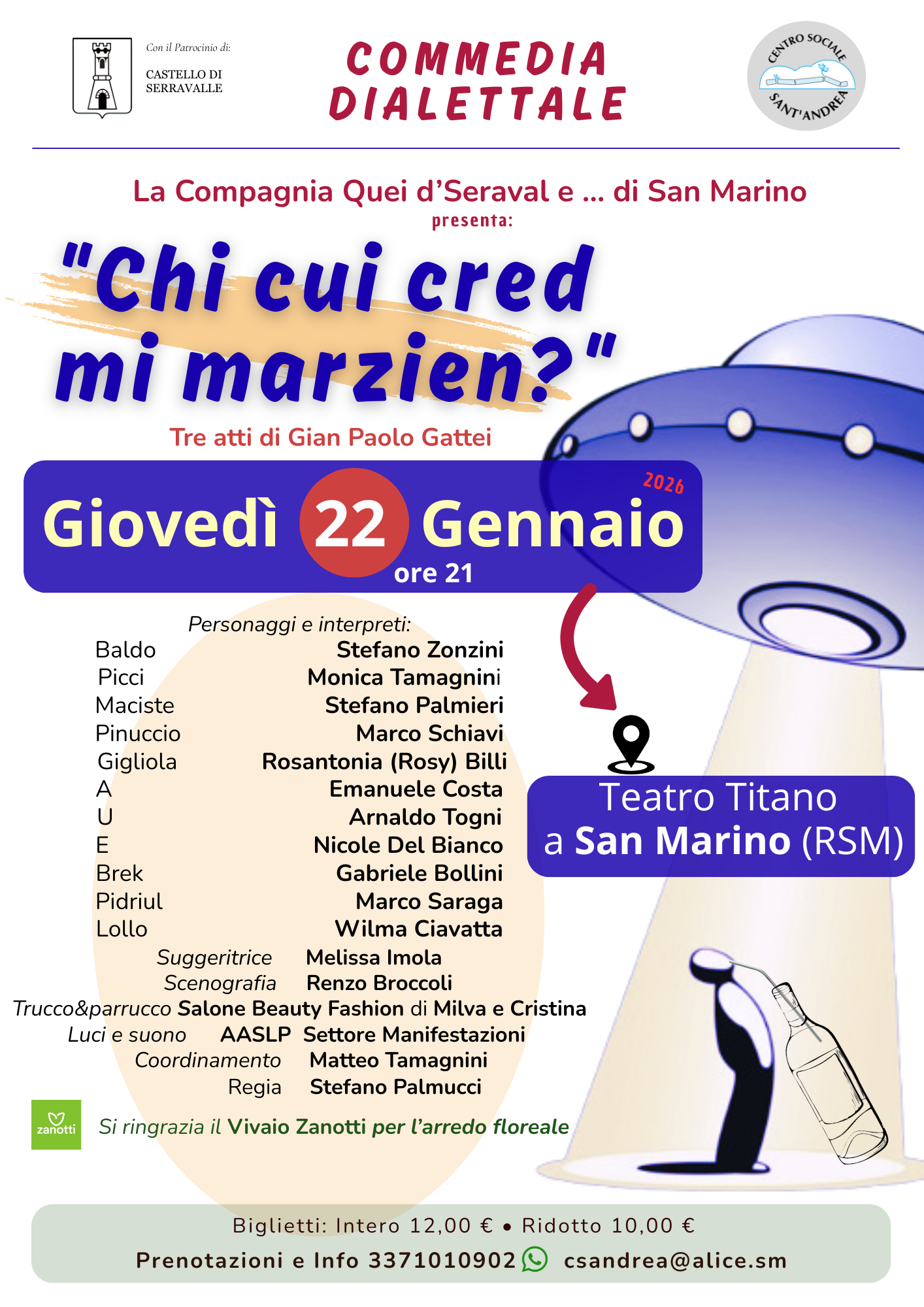 A grande richiesta la Compagnia teatrale “Quei d’Seraval e …San Marino”, replicherà la commedia “CHI CUI CRED MI MARZIEN?” di Gian Paolo Gattei, nel giorno di giovedì 22 gennaio (ore 21) al Teatro Titano di San Marino.