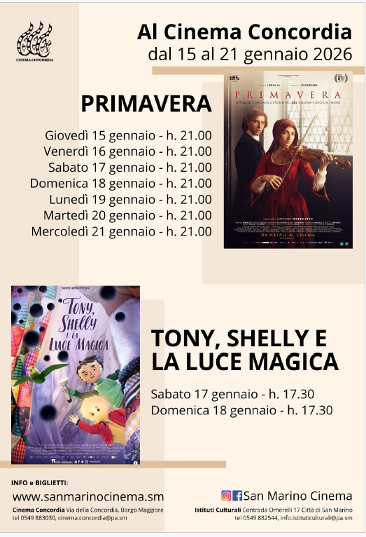 Eventi e Mostre Programmazione al cinema Concordia fino al 21 gennaio 14 Gennaio 2026 angela.venturini 16 Views UltimOra