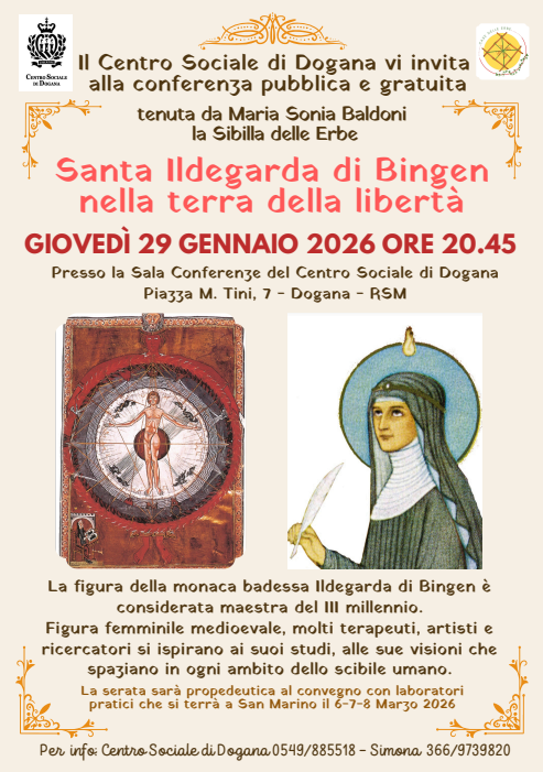 Presso il Centro Sociale di Dogana, giovedì 29 gennaio alle ore 20,45 si terrà una conferenza pubblica intitolata “Santa Ildegarda di Bingen nella terra della libertà”. Si tratta di una serata di grande interesse storico e culturale anche perchè Santa Ildegarda (dichiarata dottore della Chiesa nel 2012) possedeva tantissime capacità e talenti e, tra le tante cose, è stata guaritrice, erborista, naturalista, cosmologa, filosofa, artista, poetessa, drammaturga, musicista, linguista, ecc.