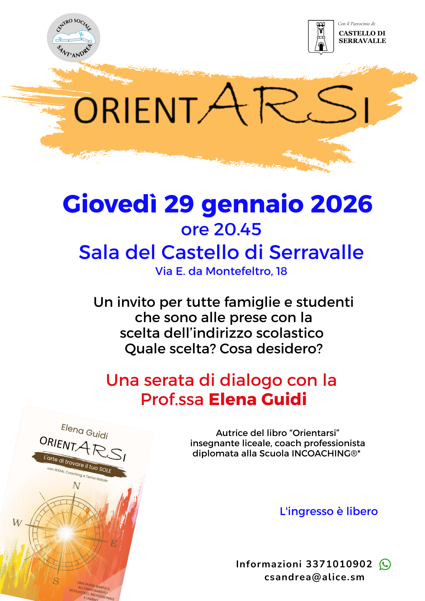 L’incontro dal tema: ORIENTARSI è in programma Giovedì 29 gennaio alle ore 20.45 nella Sala del Castello di Serravalle (Via E. da Montefeltro, 18) con ingresso libero.