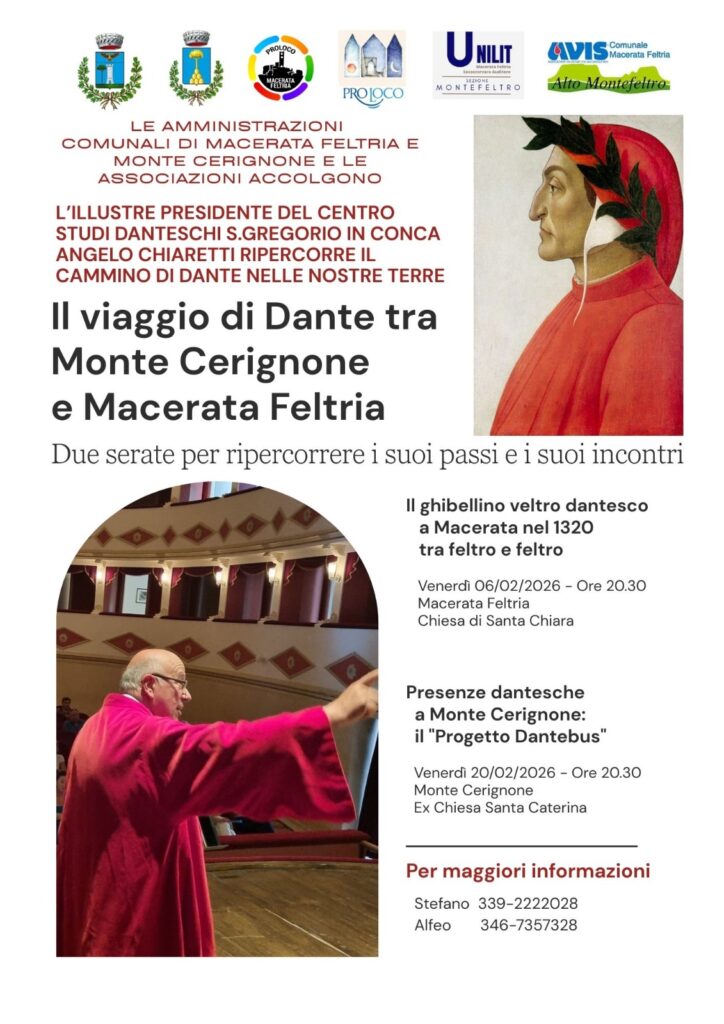 La Società di studi storici per il Montefeltro rende noto un ciclo di incontri dedicati a Dante Alighieri che, nel suo peregrinare. ha toccato due importanti comunità montefeltresche: Macerata Feltria e Monte Cerignone.