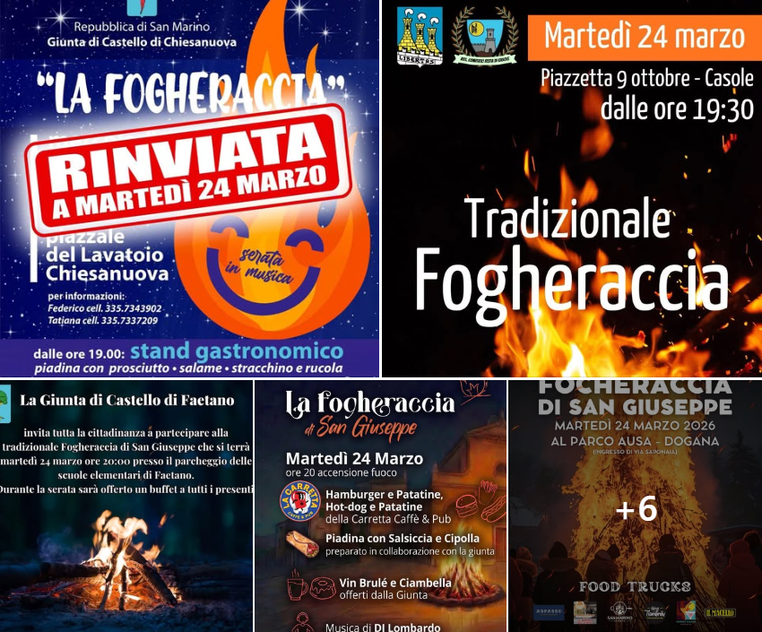 Ci saranno falò accesi, feste, musica e buon cibo in tutti i 9 Castelli di San Marino e alcune frazioni, generalmente organizzati dalle Giunte di Castello e anche da associazioni private.
