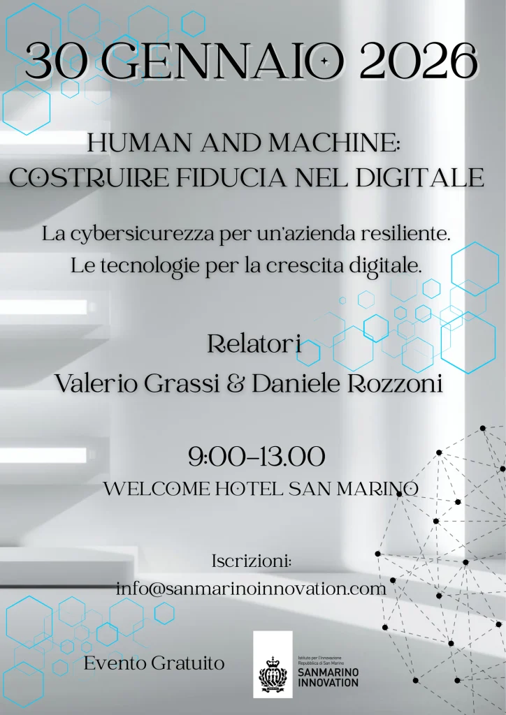 PROGRAMMA: 30 GENNAIO 2026 – WELCOME HOTEL SAN MARINO “HUMAN AND MACHINE: COSTRUIRE FIDUCIA NEL DIGITALE LA CYBERSICUREZZA PER UN’AZIENDA RESILIENT” Relatore: Valerio Grassi.