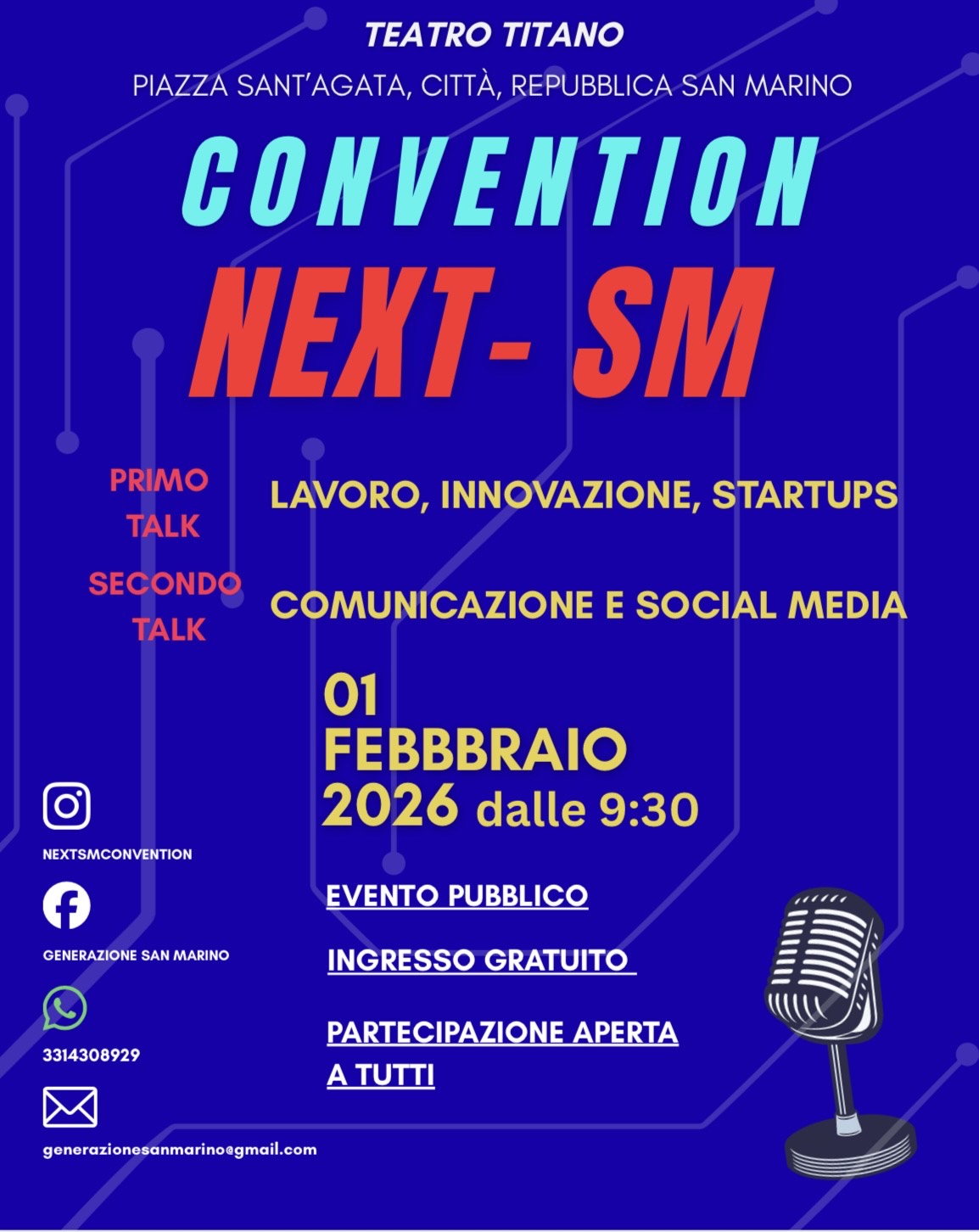 Si terrà sabato 1° febbraio 2026, a partire dalle ore 9.30, presso il Teatro Titano di San Marino, la Convention NEXT-SM, evento pubblico a ingresso gratuito nato da un’idea di giovani sammarinesi con l’obiettivo di creare contenuti, spazi di confronto e momenti di dialogo pensati da giovani, per i giovani.