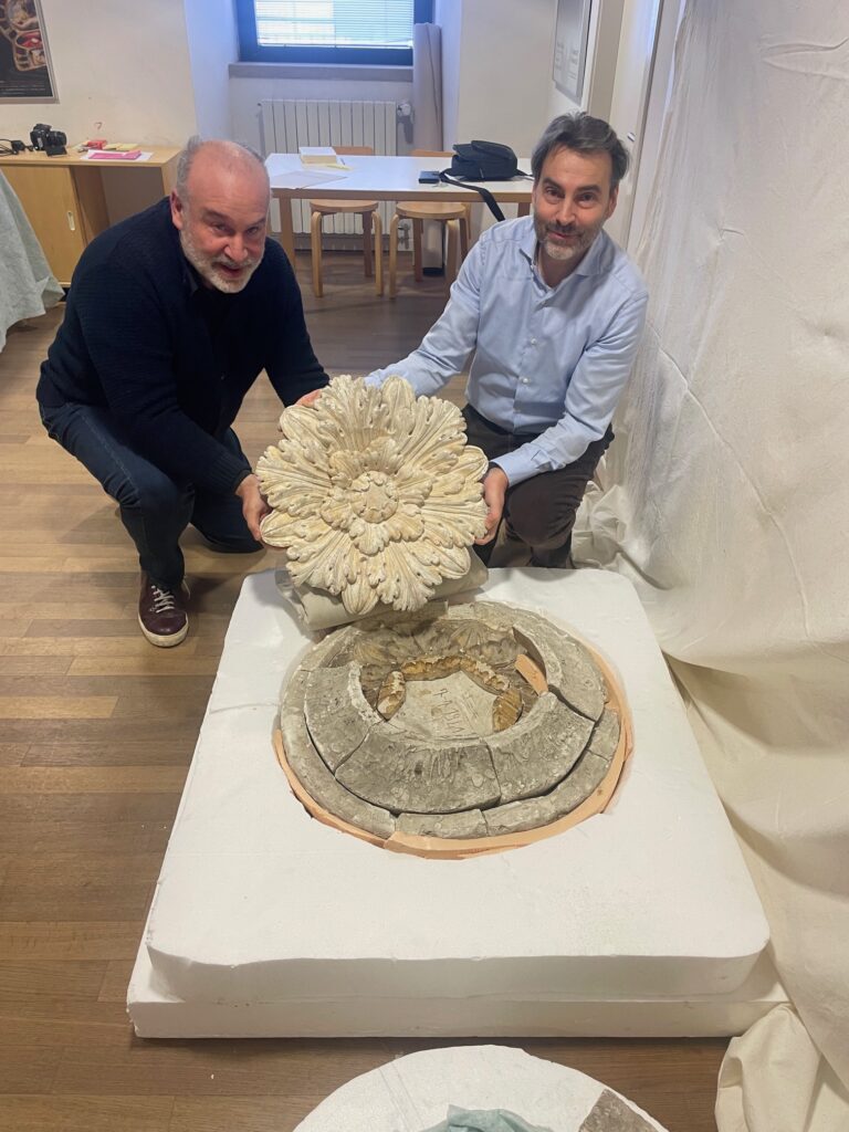 Tra gli elementi preparatori della cantoria dell’organo della Basilica sono stati individuati, ricomposti e studiati tre matrici delle decorazioni delle mensole e il modello preparatorio dei festoni che decorano il parapetto.
