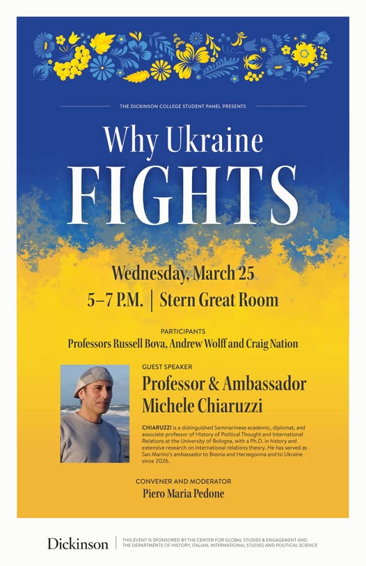 La nomina di Chiaruzzi, direttore del Centro di Ricerca per le Relazioni Internazionali dell’Università sammarinese, e professore presso l’Università di Bologna, prevede anche una conferenza dal titolo Why Ukraine Fights (Perché l’Ucraina combatte). Si tratta di un tema affrontato nell’omonimo libro scritto con Sofia Ventura, presentato prima a San Marino e poi in numerose sedi italiane, tra le quali il Senato della Repubblica e l’Accademia delle Scienze. Alla conferenza americana, che si svolgerà il 25 marzo nella Stern Great Room del Dickinson College, prenderanno parte, tra gli altri, Robert Craig Nation, Andy Wolff e Russel Bova, tutti professori di studi internazionali.