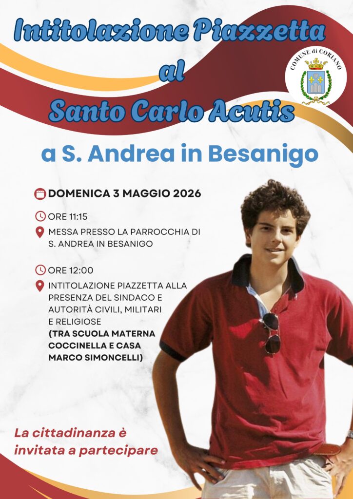 Domenica 3 maggio il Comune di Coriano intitolerà a San Carlo Acutis la piazzetta antistante la scuola dell’infanzia “La Coccinella”, in località Sant’Andrea in Besanigo. Alla cerimonia saranno presenti il Sindaco, gli assessori e le autorità civili e religiose.