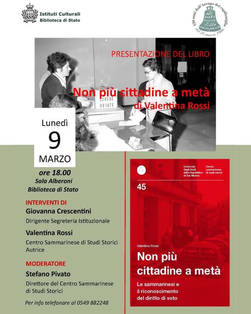 San Marino. Alla Biblioteca di Stato la presentazione del libro: “Non più cittadine a metà. Le sammarinesi e il riconoscimento del diritto di voto”
