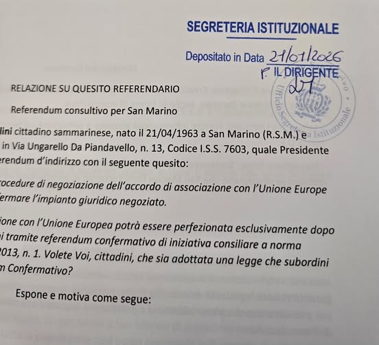 Nella giornata del 21 gennaio, è stato presentato il nuovo quesito del “Comitato I CapiFamiglia” per il referendum sull’associazione di San Marino all’Unione Europea. Il nuovo testo prende in prestito, pressoché per intero, il quesito già approvato e sottoposto a referendum nel 2013, indicazione “suggerita” anche dallo stesso Collegio dei Garanti nella sentenza precedente.