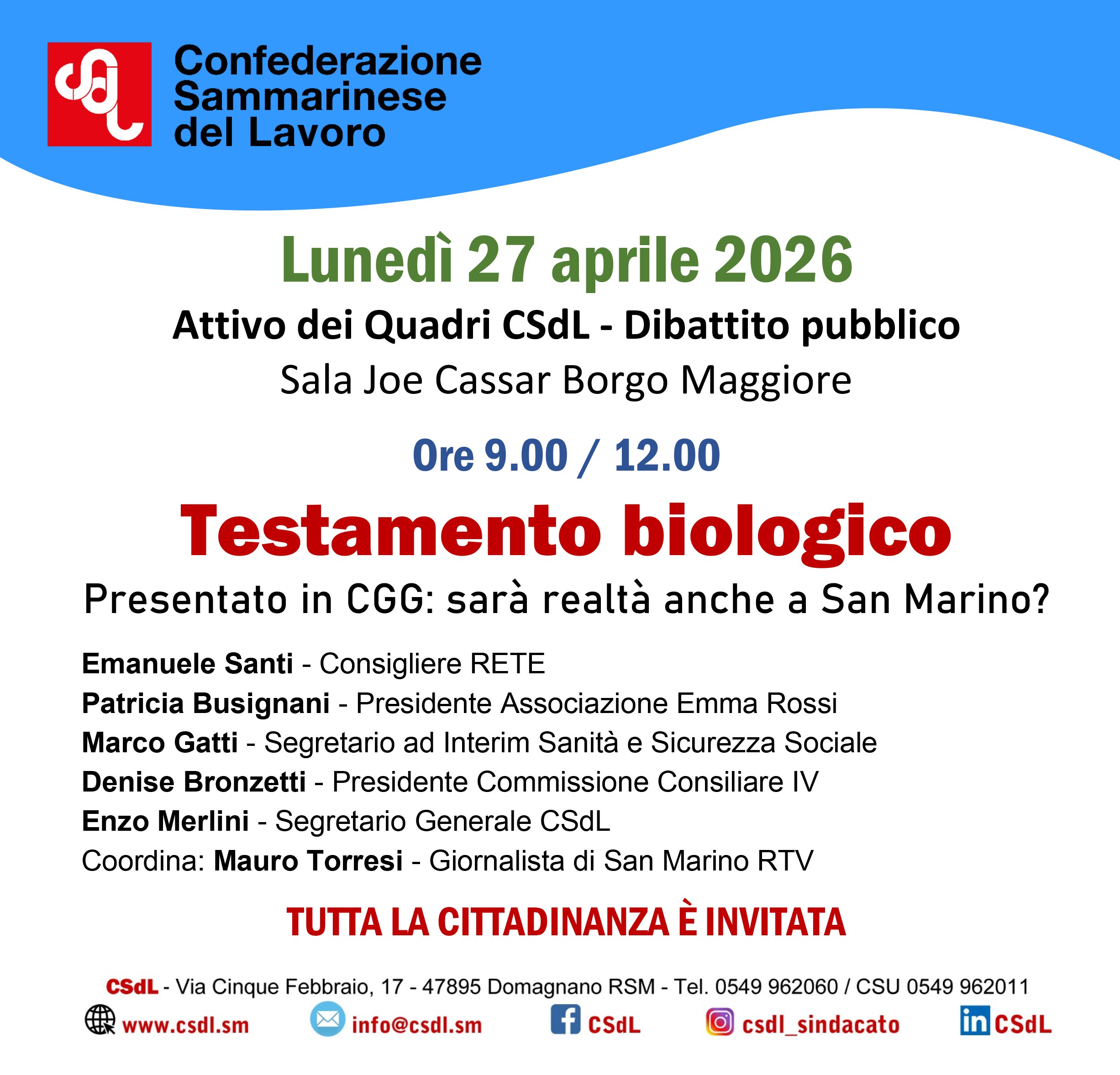 Per quanto ci riguarda, lo faremo con i nostri Quadri sindacali Lunedì 27 aprile prossimo alle ore 9.00 presso la sala Joe Cassar di Borgo Maggiore. Saranno nostri ospiti i rappresentanti delle organizzazioni proponenti i due progetti di legge, Emanuele Santi e Patricia Busignani, il Segretario di Stato ad interim per la Sanità e Sicurezza Sociale Marco Gatti, la Presidente della Commissione Consiliare competente in materia Denise Bronzetti e il Segretario Generale CSdL Enzo Merlini. Il dibattito sarà moderato da Mauro Torresi, giornalista di San Marino RTV, ed è pubblico, quindi aperto a tutti coloro che vorranno assistere e partecipare, anche con proprie domande e considerazioni.