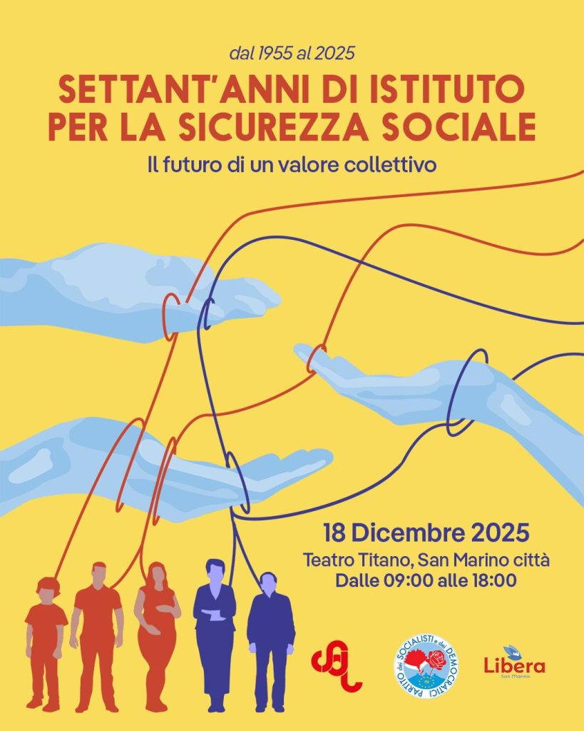 “Dal 1955 al 2025. Settant’anni di Istituto per la Sicurezza Sociale: storia e futuro di un valore collettivo”, è il titolo del convegno, in programma giovedì 18 dicembre presso il Teatro Titano; i lavori si svolgeranno la mattina dalle 9.00 alle 12.30, e il pomeriggio dalle 14.00 alle 17.30. Hanno preso la parola il Segretario CSdL Enzo Merlini, il Segretario del PSD Luca Lazzari e il Segretario di Libera Giulia Muratori.