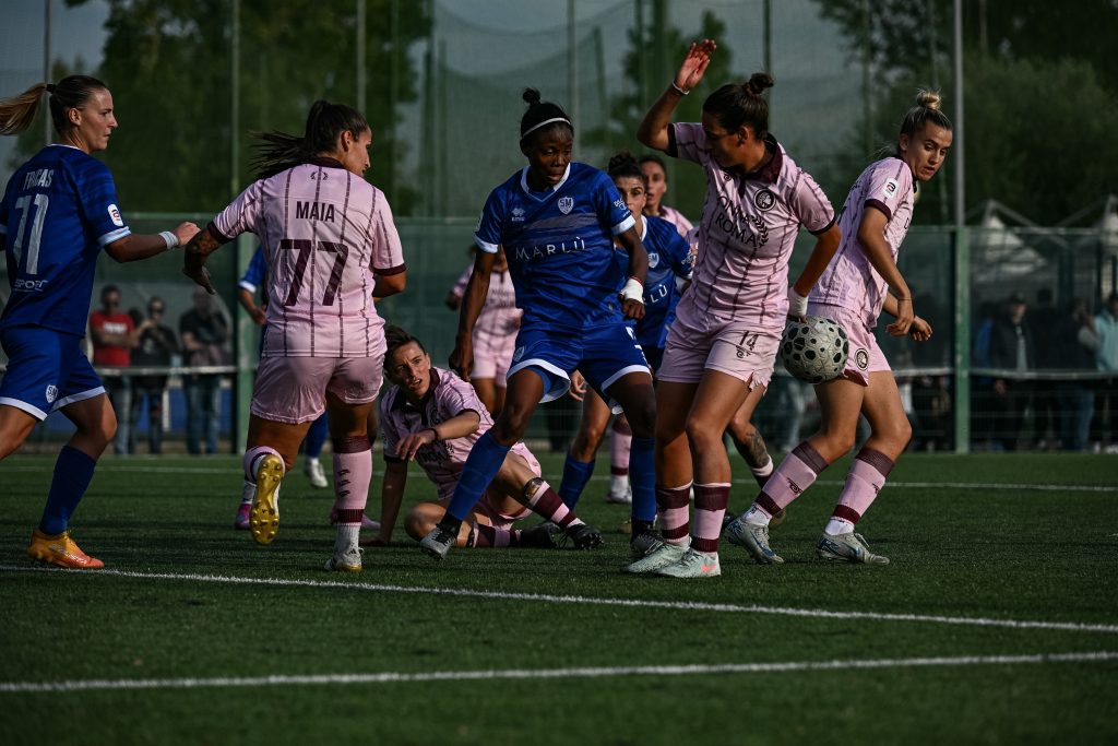 Le Titane cancellano lo 0 alla voce punti raccogliendo i frutti di una prestazione solida e di grande concentrazione sul campo della Res Roma, notoriamente ostico. Ne derivano un pareggio di spessore ed il primo clean sheet stagionale. Giacomo Piva si affida ancora alla difesa a tre che, orfana di Magni, prevede Manzetti al centro e Daple e Congia in posizione di “braccetti”. Le redini dell’attacco sono sempre affidate alla coppia Sechi – Fracas. La Res la mette subito su un piano di ritmo alto e pressione forte. Dopo 6’ si registrano già due conclusioni delle padrone di casa: quella di Martinovic, fuori di poco, e quella di Zazzera, che salta Limardi in uscita, si defila un po’ e poi calcia in porta, protetta dal ritorno provvidenziale di Congia. Poi ci prova Ikeguchi su punizione: destro potente e teso, ma che si abbassa con un istante di ritardo. Anche il primo squillo delle Titane è su piazzato: Giuliani cerca le compagne con una traiettoria tesa, la difesa romana non riesce ad allontanare e Fracas chiude l’azione con una rovesciata coraggiosa, ma fuori. Zazzera si muove lungo tutto il fronte d’attacco e la sua posizione la rende una delle clienti più pericolose e scomode per la difesa biancoazzurra. Scollinato il quarto d’ora, l’ex Fiorentina accetta l’invito al tiro di Martinovic: destro forte in corsa che sibila sopra la traversa. Anche Palombi va vicina al bersaglio sulla palla scodellata in area da Montemezzo: controllo e girata improvvisa, con palla a lato di poco. La prima metà del primo tempo è indubbiamente appannaggio della Res Donna Roma. Ma alla distanza le Titane emergono. Merolla deve spendere una parata non banale sulla rasoiata mancina di Fracas dopo un gran lavoro di Sechi. Poi va giù rapidamente anche sulla spizzata sempre di Fracas su punizione di Giuliani. La Res, nel frattempo, si era vista solo con una percussione profonda di Petrova conclusa con un destro troppo alto. Nel finale di frazione le locali provano nuovamente ad alzare il baricentro e la linea di pressione, senza tuttavia spremerne nulla di concreto.