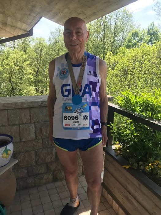 Il sammarinese Libero Barulli, classe ’47, già presidente del CONS, maratoneta. Vince ancora medaglie. Domenica 19 aprile alla Rimini Marathon, 10 mila atleti ai nastri di partenza, è arrivato terzo di categoria M75 mezza maratona in 2h 40m 32s.