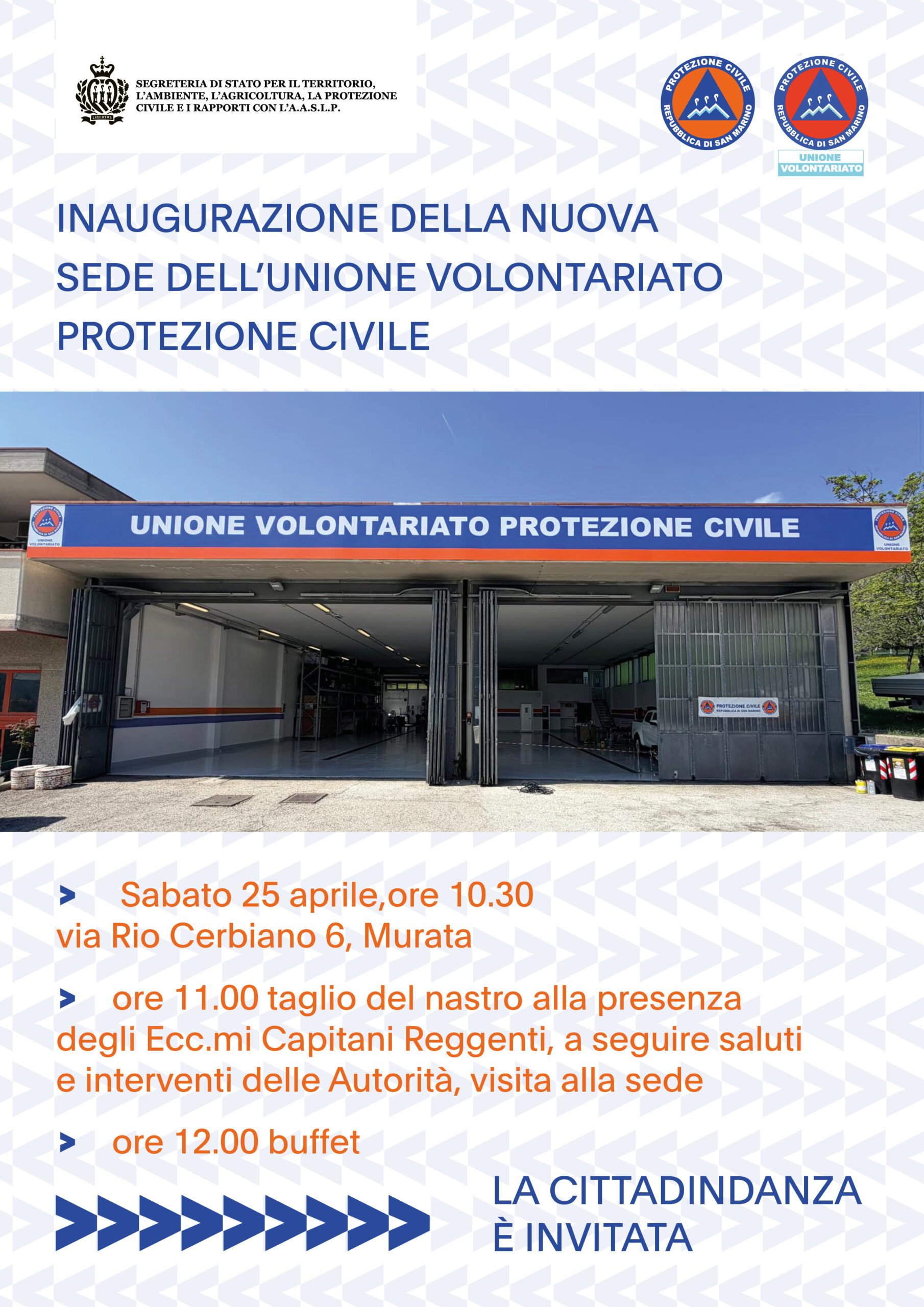 La Segreteria di Stato per il Territorio, l’Ambiente, l’Agricoltura, la Protezione Civile e i Rapporti con l’A.A.S.L.P. comunica che sabato 25 aprile si terrà l’inaugurazione della nuova sede dell’Unione Volontariato Protezione Civile, situata in via Rio Cerbiano n. 6, nel Castello di Murata.