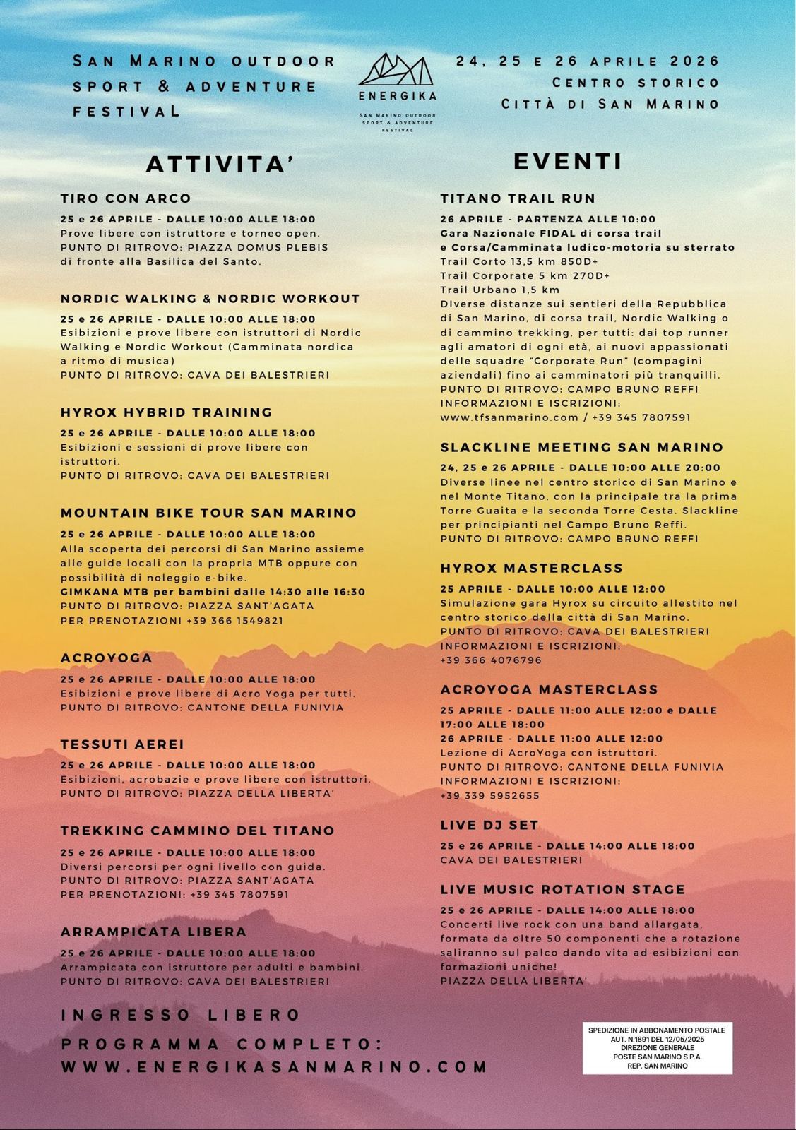 Tra le novità dell’edizione 2026 Hyrox Hybrid Training, esibizioni di prove libere con istruttori e Hyrox Masterclass, simulazione gara sul circuito allestito nel centro storico di San Marino. Torna la Titano Trail Run, in programma domenica 26 aprile, che porterà atleti e appassionati lungo i suggestivi sentieri della Repubblica di San Marino, con percorsi adatti a diversi livelli di preparazione. Energika è anche sinonimo di intrattenimento e convivialità. Durante tutta la manifestazione saranno presenti momenti dedicati alla musica contribuendo a creare un’esperienza completa all’insegna dell’energia, della condivisione e dello stile di vita attivo, live dj set il 25 e 26 aprile alla Cava dei Balestrieri, live music rotation negli stessi giorni e orari in Piazza della Libertà, concerti live e rock con una band allargata formata da 50 componenti che a rotazione daranno il via a esibizioni con formazioni uniche.